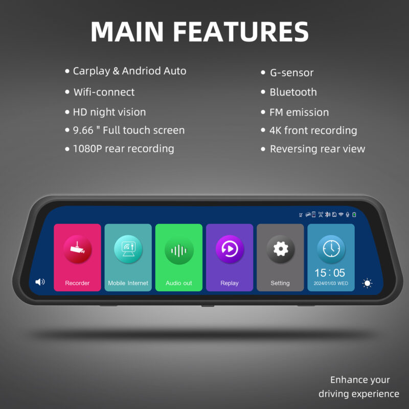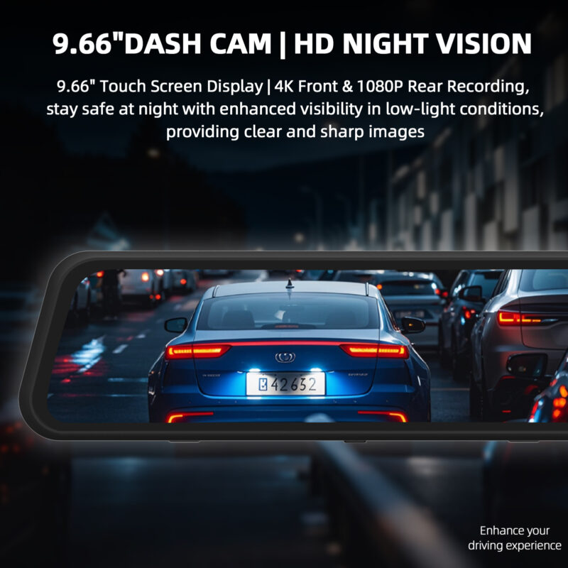 9.66 Inch Front 4k and Rear 1080P Recording Dash Cam
